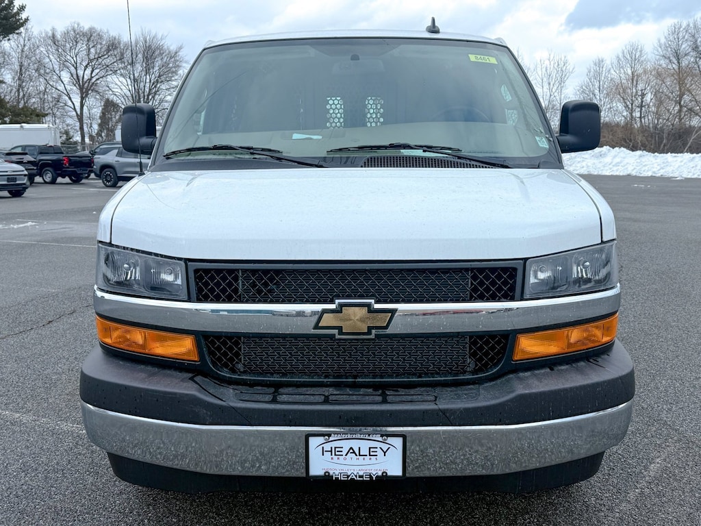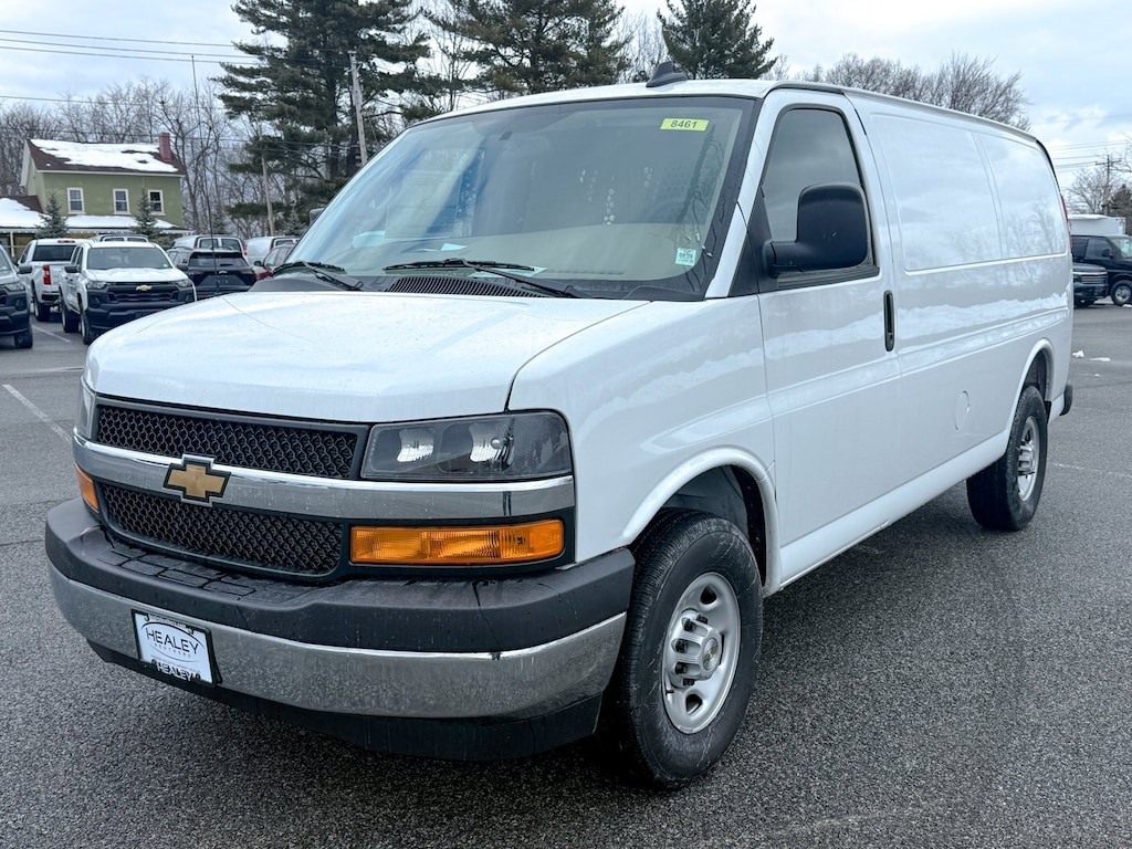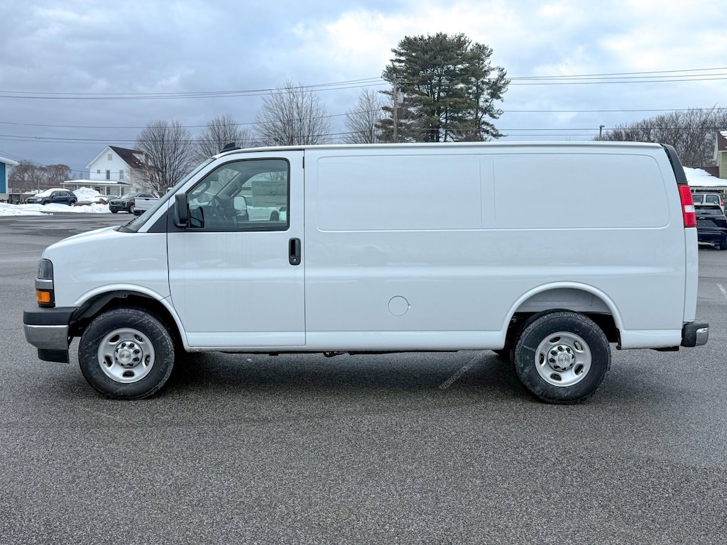 Summit White 2025 Chevrolet Express 2500 Work Van Cargo RWD 8-Speed Automatic with Overdrive 4.3L V6 150 Amp Alternator, 16 x 6.5 Steel Wheels, 2 Speakers, 3.42 Rear Axle Ratio, 4-Wheel Disc Brakes, ABS brakes, Air Conditioning, AM/FM radio, AM/FM Stereo w/MP3 Player, Chrome Appearance Package, Chrome Grille, Cruise Control, Delay-off headlights, Driver & Front Passenger High-Back Bucket Seats, Driver Convenience Package, Driver door bin, Driver's Seat Mounted Armrest, Dual front impact airbags, Dual front side impact airbags, Electronic Stability Control, Engine Cover Console w/Swing-Out Storage Bin, Exterior Parking Camera Rear, Fixed Rear Door Window Glass, Fixed Rear Side Door Window Glass, Front & Rear Chrome Bumpers w/Step-Pad, Front anti-roll bar, Front Bucket Seats, Front Reclining High-Back Bucket Seats, Front wheel independent suspension, Full-Length Black Rubberized-Vinyl Floor Covering, Fully automatic headlights, Heated door mirrors, Heavy-Duty Rear Locking Differential, Heavy-Duty Trailering Equipment, High & Low Dual-Note Horn, Low tire pressure warning, Occupant sensing airbag, Overhead airbag, Passenger cancellable airbag, Passenger door bin, Passenger seat mounted armrest, Power door mirrors, Power steering, Power windows, Preferred Equipment Group 1WT, Rear & Side Cargo Door Glass, Rear Side Door Glass Window Security Bar, Reclining Front Bucket Seats w/Inboard Armrests, Remote Keyless Entry, Single-Zone Manual Air Conditioning, Tachometer, Theft Alarm Notification, Tilt Steering Wheel, Traction control, Trip computer, Variably intermittent wipers, Vinyl Seat Trim, Voltmeter.