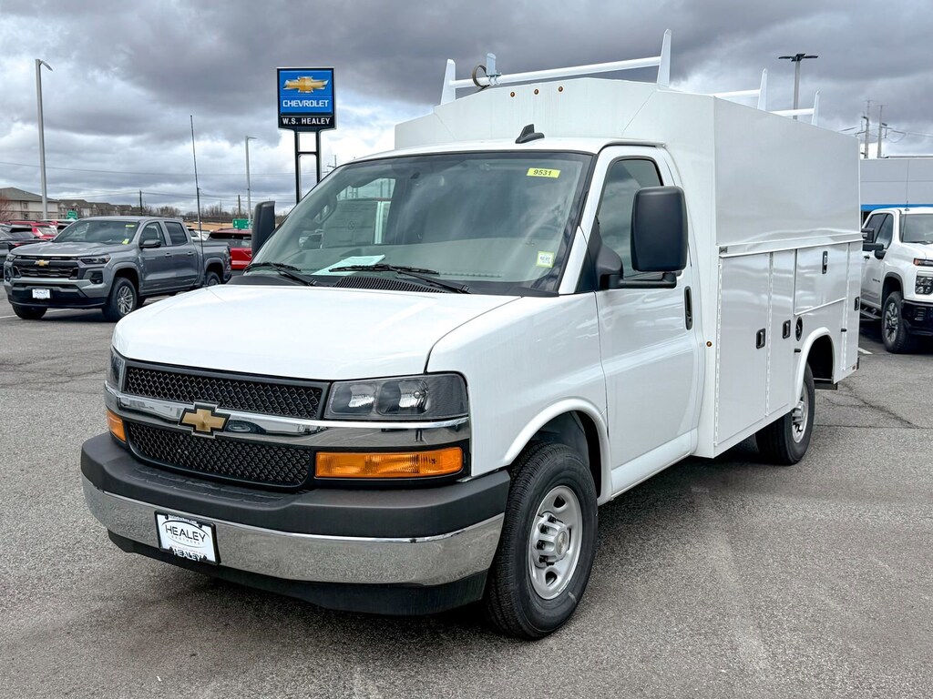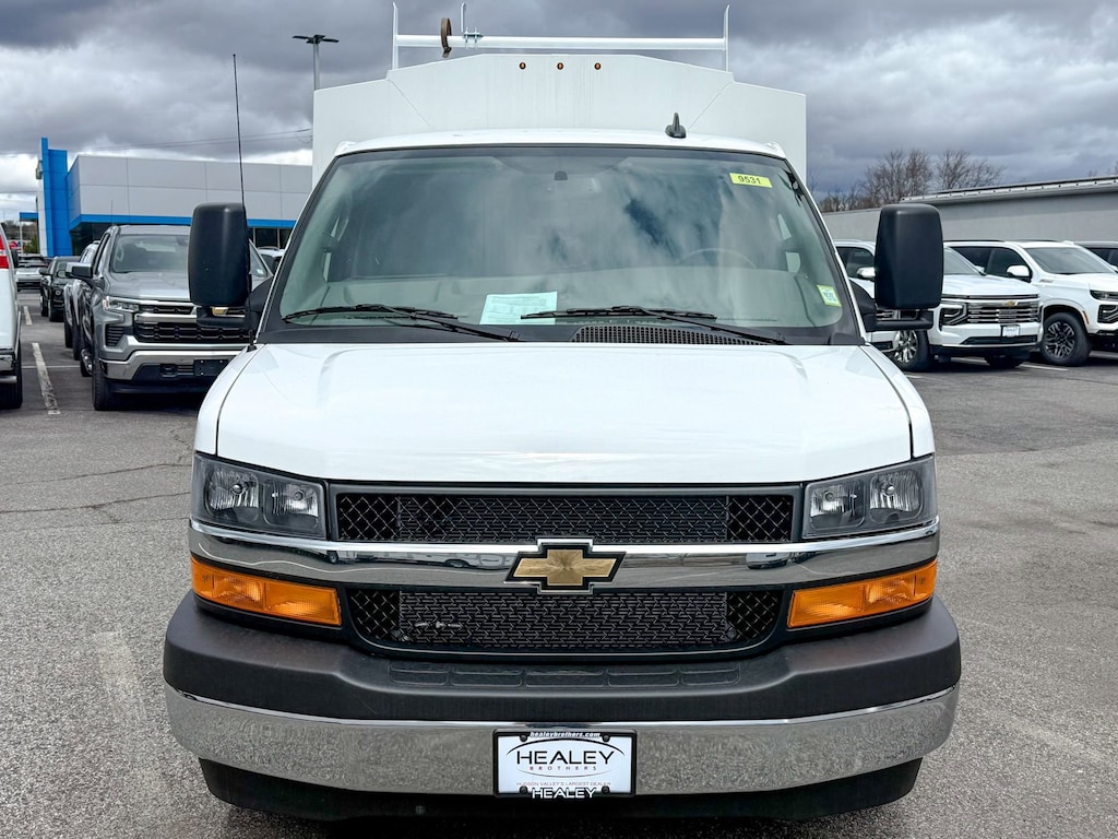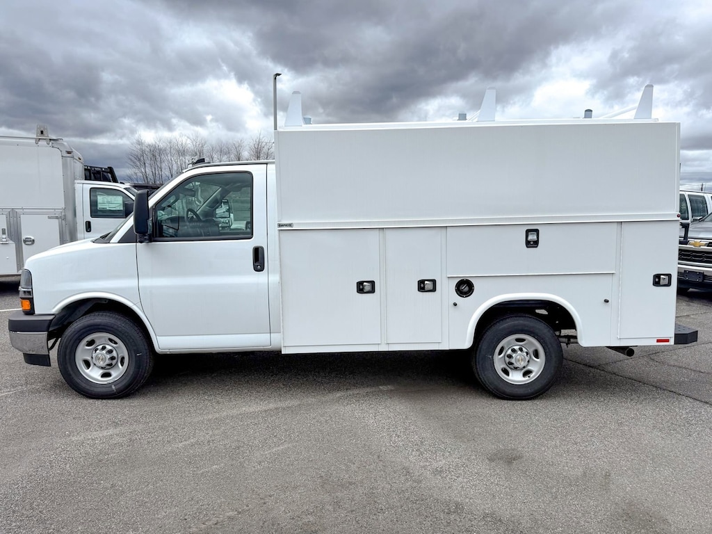 Summit White 2025 Chevrolet Express 3500 Work Van Cutaway RWD 8-Speed Automatic 6.6L V8 2 Speakers, 3.42 Rear Axle Ratio, 4-Wheel Disc Brakes, ABS brakes, Air Conditioning, AM/FM radio, Bluetooth Phone Connection Kit (LPO), Chrome Appearance Package, Chrome Grille, Cruise Control, Delay-off headlights, Driver & Front Passenger High-Back Bucket Seats, Driver & Front Passenger Vinyl Visors, Driver Convenience Package, Driver door bin, Driver's Seat Mounted Armrest, Dual front impact airbags, Dual front side impact airbags, Electronic Stability Control, Engine Cover Console w/Swing-Out Storage Bin, Exterior Parking Camera Rear, Front anti-roll bar, Front Bucket Seats, Front Chrome Bumper w/Step-Pad, Front wheel independent suspension, Fully automatic headlights, Heavy-Duty Locking Rear Differential, Inside Rearview Mirror w/Rr Vision Camera Display, Low tire pressure warning, Occupant sensing airbag, Overhead airbag, Passenger cancellable airbag, Passenger door bin, Passenger seat mounted armrest, Power Convenience Package, Power Door Locks w/Lock-Out Protection, Power steering, Power Windows, Preferred Equipment Group 1WT, Radio: AM/FM Stereo w/MP3 Player & Digital Clock, Reclining High-Back Bucket Seats w/Inboard Armrests, Remote Keyless Entry, Single Rear Wheel Configuration, Tachometer, Theft Alarm Notification, Tilt Steering Wheel, Traction control, Trip computer, Variably intermittent wipers, Vinyl Seat Trim, Voltmeter, Wheels: 16 x 6.5 8-Lug Painted Steel HD (4).