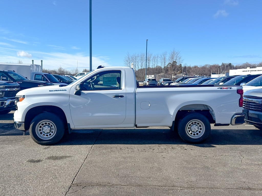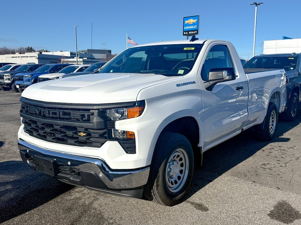Summit White 2026 Chevrolet Silverado 1500 WT 4WD 10-Speed Automatic EcoTec3 5.3L V8 120-Volt Bed Mounted Power Outlet, 120-Volt Interior Power Outlet, 170 Amp Alternator, 2 Speakers, 2-Speaker Audio System, 220 Amp Alternator, 3.5 Monochromatic Display Driver Info Center, 4-Way Manual Driver Seat Adjuster, 4-Wheel Disc Brakes, 40/20/40 Front Split Bench Seat, ABS brakes, Air Conditioning, Apple CarPlay/Android Auto, Auto High-beam Headlights, Auto-Locking Rear Differential, Automatic Emergency Braking, Auxiliary External Transmission Oil Cooler, Black (Semi-Gloss) Front Bumper, Black (Semi-Gloss) Rear Bumper, Bluetooth® For Phone, Brake assist, Chevytec Spray-on Black Bedliner, Compass, Deep-Tinted Glass, Delay-off headlights, Deleted Mobile Service Plus, Driver door bin, Dual front impact airbags, Dual front side impact airbags, Electric Rear-Window Defogger, Electronic Cruise Control, Electronic Stability Control, Emergency communication system: OnStar, External Engine Oil Cooler, EZ Lift Power Lock and Release Tailgate, Following Distance Indicator, Forward Collision Alert, Front anti-roll bar, Front Center Armrest w/Storage, Front Chrome Bumper, Front Frame-Mounted Black Recovery Hooks, Front License Plate Kit, Front Pedestrian Braking, Front reading lights, Front wheel independent suspension, Fully automatic headlights, HD Rear Vision Camera, Heated door mirrors, Heated Power-Adjustable Outside Mirrors, High Gloss Black Mirror Caps, Hitch Guidance, Illuminated entry, Inside Rearview Mirror with Tilt, Integrated Trailer Brake Controller, IntelliBeam Automatic High Beam on/Off, Lane Change Alert with Side Blind Zone Alert, Lane Keep Assist with Lane Departure Warning, Locking Tailgate, Low tire pressure warning, Manual Tailgate Function with No EZ Lift, Manual Tilt Wheel Steering Column, Occupant sensing airbag, OnStar Services Capable, Outside temperature display, Overhead airbag, Overhead console, Panic alarm, Passenger door bin, Passenger vanity mirror, Perimeter Lighting, Power door mirrors, Power Front Windows with Driver Express Up/Down, Power Front Windows with Passenger Express Down, Power steering, Power windows, Preferred Equipment Group 1WT, Premium audio system: Chevrolet Infotainment 3, Radio data system, Radio: Chevrolet Infotainment 3 System, Rear Chrome Bumper, Rear Cross Traffic Braking, Rear Pedestrian Alert, Rear reading lights, Rear step bumper, Remote Keyless Entry, Remote keyless entry, Rubberized-Vinyl Floor Covering, SiriusXM Delete, Solar Absorbing Tinted Glass, Speed control, Speed-sensing steering, Standard Suspension Package, Standard Tailgate, Tachometer, Teen Driver, Tilt steering wheel, Tire Pressure Monitoring System, Traction control, Trailering Package, Trip computer, Ultrasonic Front and Rear Park Assist, Variably intermittent wipers, Vinyl Seat Trim, Voltmeter, Wheels: 17 x 8 Ultra Silver Painted Steel, Wi-Fi Hot Spot Capable, WT Convenience Package, WT Safety Package, WT Value Package.