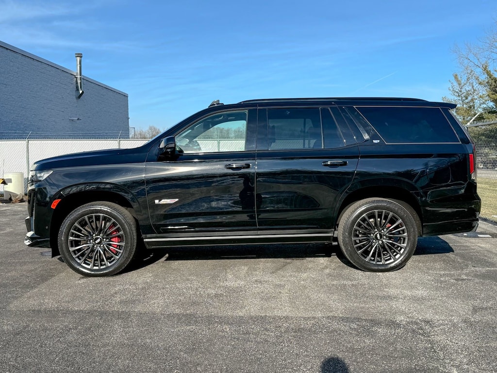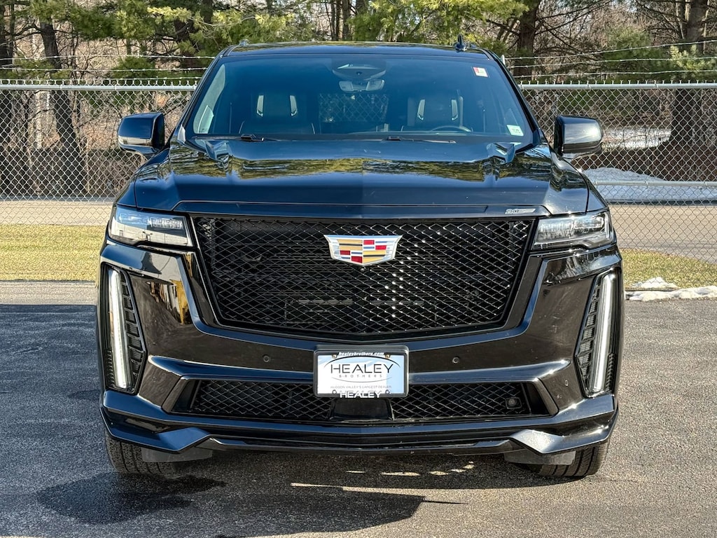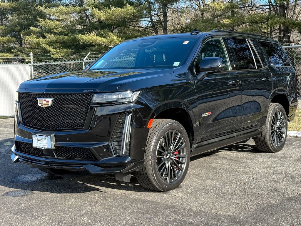 Certified. Black Raven 2024 Cadillac Escalade V-Series AWD 10-Speed Automatic with Overdrive 6.2L V8 Supercharged Cadillac Certified Pre-Owned Certified, AWD, Jet Black Leather, 16.9 Diagonal OLED Infotainment Screen, 2-Presets Memory For Driver Seat Adjuster, 3.23 Axle Ratio, 3rd row seats: split-bench, 4-Way Power Driver Lumbar Seat Adjuster, 4-Way Power Front Passenger Lumbar Seat Adjuster, 4-Wheel Disc Brakes, 8-Way Power Driver Seat Adjuster, 8-Way Power Front Passenger Seat Adjuster, A/V remote, ABS brakes, Active Noise Cancellation, Adaptive Cruise Control, Adaptive suspension, Air Conditioning, Air Ride Adaptive Suspension, AKG Studio Reference 36-Speaker Audio System, All-Weather Floor Liner Package (LPO), All-Weather Integrated Cargo Liner (LPO), Alloy wheels, AM/FM radio: SiriusXM with 360L, Apple CarPlay/Android Auto, Audio memory, Auto High-beam Headlights, Auto tilt-away steering wheel, Auto-dimming door mirrors, Auto-dimming Rear-View mirror, Automatic Seat Belt Tightening, Automatic temperature control, Body-Color Door Handles, Brake assist, Bumpers: body-color, Compass, Cooled Console w/Covered Storage, Delay-off headlights, Door auto-latch, Door Lock & Latch Shields, Driver door bin, Driver vanity mirror, Dual front impact airbags, Dual front side impact airbags, Electronic Limited-Slip Differential, Electronic Stability Control, Emergency communication system: OnStar and Cadillac connected services capable, Enhanced Automatic Emergency Braking, Enhanced Automatic Parking Assist, Exterior Parking Camera Rear, Floor Console w/Covered Storage, Floor Liner Package (LPO), Four wheel independent suspension, Front anti-roll bar, Front Auxiliary 12-volt Power Outlet, Front Bucket Seats, Front Center Armrest w/Storage, Front dual zone A/C, Front License Plate Bracket, Front reading lights, Full Semi-Aniline Leather Seat Trim, Fully automatic headlights, Garage door transmitter, Genuine wood console insert, Genuine wood dashboard insert, Genuine wood door panel insert, Glass Breakage Sensor, Gloss Black Escalade Nameplate (LPO), HD Radio, Headphones, Heads-Up Display, Heated & Ventilated Driver & Front Passenger Seats, Heated door mirrors, Heated Driver & Front Passenger Seats, Heated front seats, Heated rear seats, Heated steering wheel, Heavy-Duty Trailering Package, Hitch Guidance w/Hitch View, Illuminated entry, Illuminating Front & Rear Sill Plates, Integrated Trailer Brake Controller, Leather steering wheel, Low tire pressure warning, Magnetic Ride Control Suspension, Memory seat, Monochrome Cadillac Emblems (LPO), Navigation System, Night vision lights, Occupant sensing airbag, Onyx Package (LPO), Outside temperature display, Overhead airbag, Overhead console, Panic alarm, Passenger door bin, Passenger vanity mirror, Platinum Interior Trim, Power door mirrors, Power driver seat, Power Liftgate, Power Lumbar Massage Driver Seat, Power Lumbar Massage Front Passenger Seat, Power moonroof, Power Panoramic Tilt-Sliding Sunroof, Power passenger seat, Power steering, Power windows, Power-Retractable Assist Steps, Preferred Equipment Group 1SD, Radio data system, Radio: AM/FM w/Navigation, Rain sensing wipers, Rear air conditioning, Rear anti-roll bar, Rear audio controls, Rear Camera Mirror, Rear Camera Mirror Washer, Rear Cross Traffic Alert, Rear reading lights, Rear Seat Entertainment System, Rear window defroster, Rear window wiper, Reconfigurable Full-Color Head-Up Display, Remote keyless entry, Reverse Automatic Braking, Security system, SiriusXM w/360L, Smart Trailer Integration Indicator, Soft Closing Front & Rear Doors, Speed control, Split folding rear seat, Spoiler, Steering wheel memory, Steering wheel mounted audio controls, Tachometer, Teen Driver, Telescoping steering wheel, Theft-Deterrent Alarm System, Tilt steering wheel, Touring Package, Traction control, Trailer Side Blind Zone Alert, Trailer Tire Pressure Monitoring System, Trailering Assist Guidel