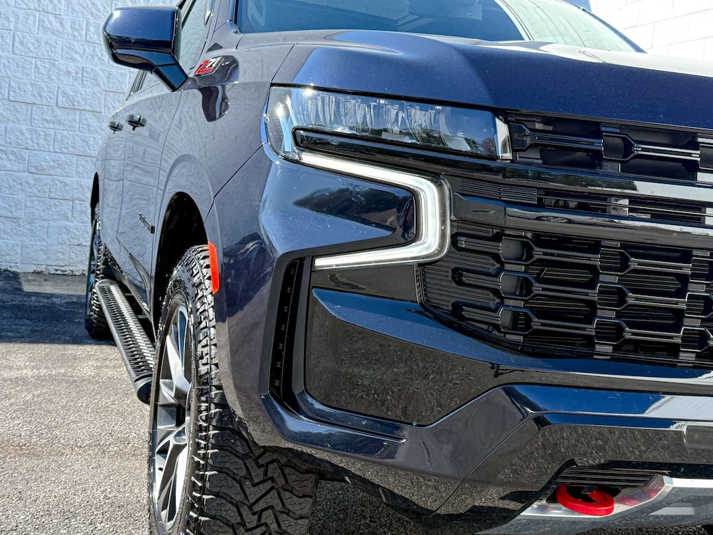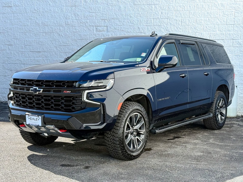 Certified. Midnight Blue Metallic 2023 Chevrolet Suburban Z71 4WD 10-Speed Automatic with Overdrive EcoTec3 5.3L V8 10-Way Power Driver & Passenger Seat Adjusters, 1st & 2nd Row Color-Keyed Carpeted Floor Mats, 2-Speed Active Electronic AutoTrac Transfer Case, 2nd Row Manual Bucket Seats, 3.23 Rear Axle Ratio, 3rd row seats: split-bench, 4-Wheel Disc Brakes, 9 Speakers, ABS brakes, Air Conditioning, Alloy wheels, AM/FM radio: SiriusXM with 360L, Apple CarPlay/Android Auto, Auto High-beam Headlights, Auto-Dimming Inside Rear-View Mirror, Auto-dimming Rear-View mirror, Automatic temperature control, Black Roof Rack Cross Rails, Black Tubular Assist Steps, Bose 9-Speaker Stereo Audio System Feature, Brake assist, Bright Front & Rear Door Sill Plates, Bumpers: body-color, Color-Keyed Carpeting Floor Covering, Compass, Delay-off headlights, Driver & Front Outboard Passenger Airbags, Driver door bin, Driver vanity mirror, Dual front impact airbags, Dual front side impact airbags, Dual-Pane Power Panoramic Sunroof, Electronic Stability Control, Emergency communication system: OnStar and Chevrolet connected services capable, Enhanced Driver Information Center, Floor Console w/Storage Area, Four wheel independent suspension, Front anti-roll bar, Front Bucket Seats, Front Center Armrest, Front dual zone A/C, Front High-Approach Angle Fascia, Front reading lights, Fully automatic headlights, Garage door transmitter, Hands-Free Rear Power Programmable Liftgate, Heated door mirrors, Heated Driver & Front Passenger Seats, Heated front seats, Heavy-Duty Air Filter, Hill Descent Control, Illuminated entry, Infotainment Display, Leather-Appointed Seating, LED Daytime Running Lamps, License Plate Front Mounting Package, Low tire pressure warning, Memory seat, Memory Settings For Driver, Navigation System, Occupant sensing airbag, Outside temperature display, Overhead airbag, Overhead console, Panic alarm, Passenger door bin, Passenger vanity mirror, Power door mirrors, Power driver seat, Power Liftgate, Power passenger seat, Power steering, Power windows, Preferred Equipment Group 2Z7, Premium audio system: Chevrolet Infotainment 3 Premium, Premium Smooth Ride Suspension, Radio: Chevrolet Infotainment 3 Premium System, Rain sensing wipers, Rear air conditioning, Rear anti-roll bar, Rear reading lights, Rear seat center armrest, Rear window defroster, Rear window wiper, Red Recovery Hooks, Remote keyless entry, Remote Start, Roof rack: rails only, Security system, SiriusXM Radio w/360L, Speed control, Speed-sensing steering, Split folding rear seat, Spoiler, Steering wheel mounted audio controls, Tachometer, Telescoping steering wheel, Tilt steering wheel, Traction control, Trip computer, Universal Home Remote, Variably intermittent wipers, Voltmeter, Wheels: 20 x 9 Machined Aluminum, Wireless Charging, Wrapped Steering Wheel.