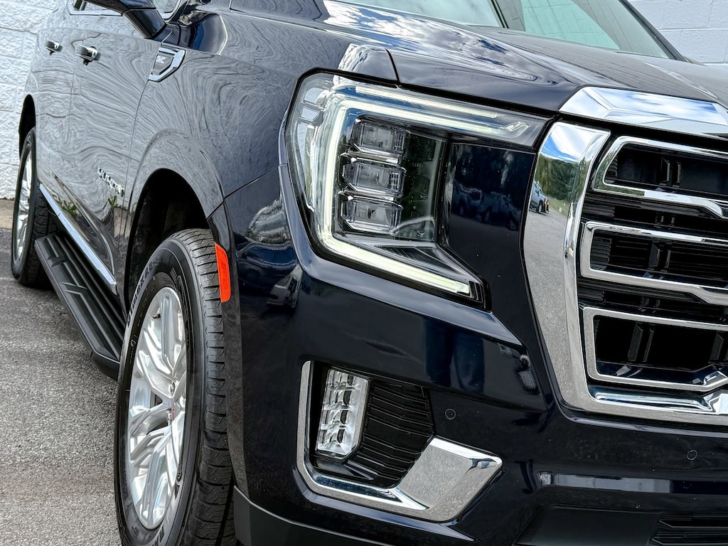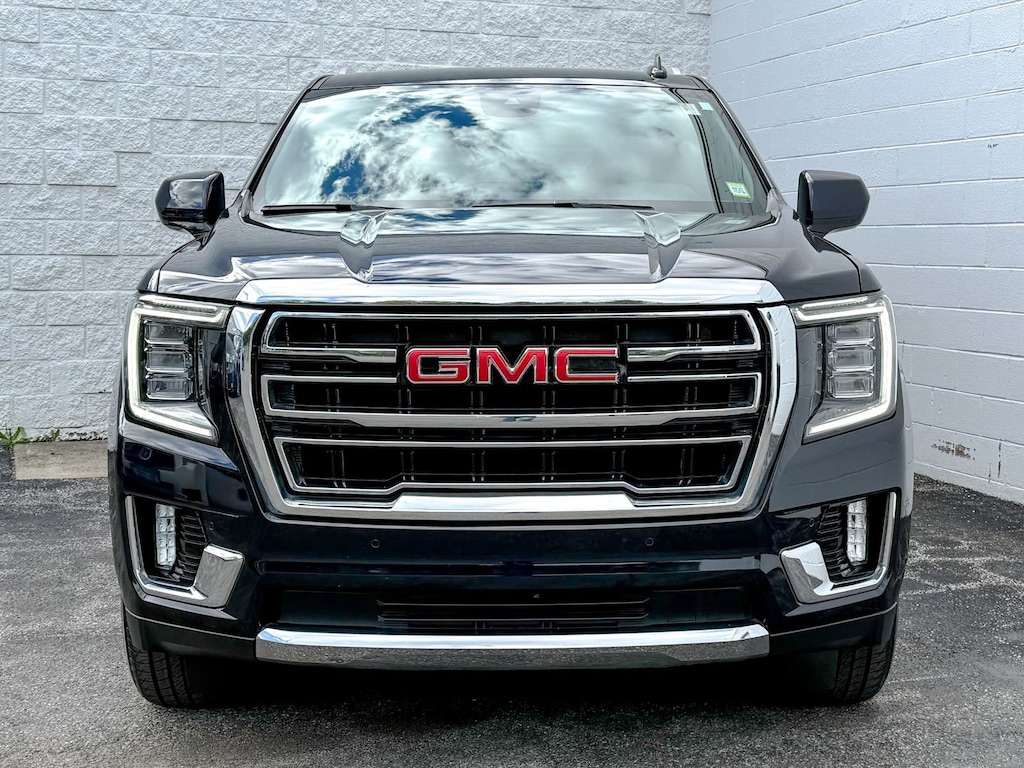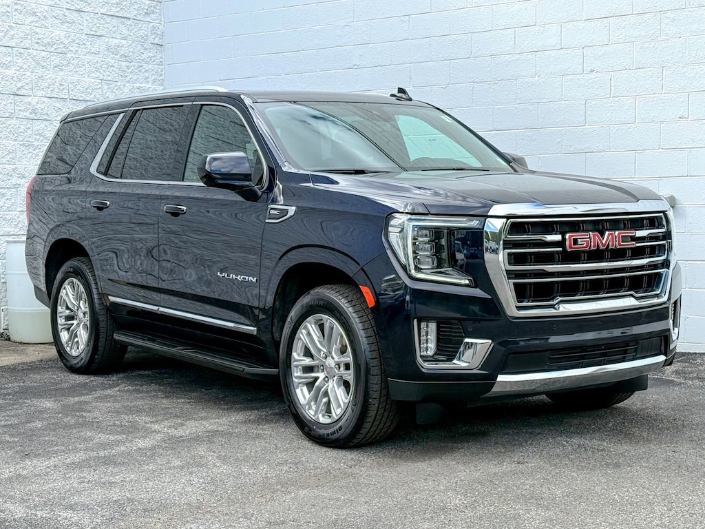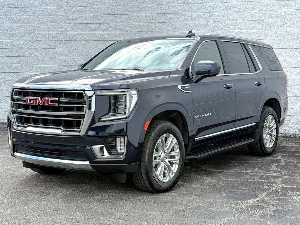 Certified. Midnight Blue Metallic 2024 GMC Yukon SLT 4WD 10-Speed Automatic with Overdrive EcoTec3 5.3L V8 12-Way Power Seat Adjusters, 2 Presets For Power Driver Seat, 3.23 Rear Axle Ratio, 3rd row seats: split-bench, 4-Wheel Disc Brakes, 9 Speakers, ABS brakes, Air Conditioning, Alloy wheels, AM/FM radio: SiriusXM with 360L, AM/FM Stereo, Apple CarPlay/Android Auto, Auto High-beam Headlights, Auto-dimming Rear-View mirror, Automatic Emergency Braking, Automatic temperature control, Bodyside moldings, Bose 9-Speaker Stereo Audio System Feature, Brake assist, Bright Chrome Bodyside Moldings, Bright Front & Rear Door Sill Plates, Bumpers: body-color, Chrome Door Handles w/Body-Color Strip, Compass, Delay-off headlights, Deleted 3 Years of OnStar Remote Access, Driver door bin, Driver vanity mirror, Dual front impact airbags, Dual front side impact airbags, Electronic Stability Control, Emergency communication system: OnStar and GMC connected services capable, Following Distance Indicator, Forward Collision Alert, Four wheel independent suspension, Front & Rear Park Assist, Front anti-roll bar, Front Bucket Seats, Front Center Armrest, Front dual zone A/C, Front fog lights, Front Pedestrian Braking, Front reading lights, Fully automatic headlights, Garage door transmitter, Hands-Free Power Programmable Rear Liftgate, Heated door mirrors, Heated Driver & Front Passenger Seats, Heated front seats, Illuminated entry, Inside Rear-View Auto-Dimming Mirror, IntelliBeam Automatic High Beam On/Off, Lane Change Alert w/Side Blind Zone Alert, Lane Keep Assist w/Lane Departure Warning, Low tire pressure warning, Memory seat, Navigation System, Occupant sensing airbag, Outside temperature display, Overhead airbag, Overhead console, Panic alarm, Passenger door bin, Passenger vanity mirror, Perforated Heated & Ventilated Dr & Frt Pass Seats, Perforated Leather-Appointed Seating, Power door mirrors, Power driver seat, Power Liftgate, Power passenger seat, Power steering, Power windows, Preferred Equipment Group 4SA, Premium Smooth Ride Suspension, Rain sensing wipers, Rear air conditioning, Rear anti-roll bar, Rear Cross Traffic Alert, Rear reading lights, Rear seat center armrest, Rear window defroster, Rear window wiper, Remote keyless entry, Roof rack: rails only, Safety Alert Seat, Security system, SiriusXM w/360L, Speed control, Speed-sensing steering, Split folding rear seat, Spoiler, Steering wheel mounted audio controls, Tachometer, Telescoping steering wheel, Tilt steering wheel, Traction control, Trip computer, Universal Home Remote, Variably intermittent wipers, Ventilated front seats, Voltmeter, Wheels: 20 x 9 6-Spoke Polished Aluminum, Wireless Charging.