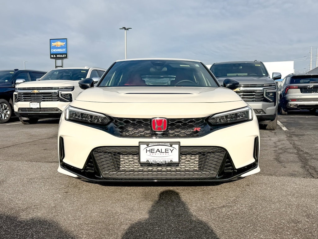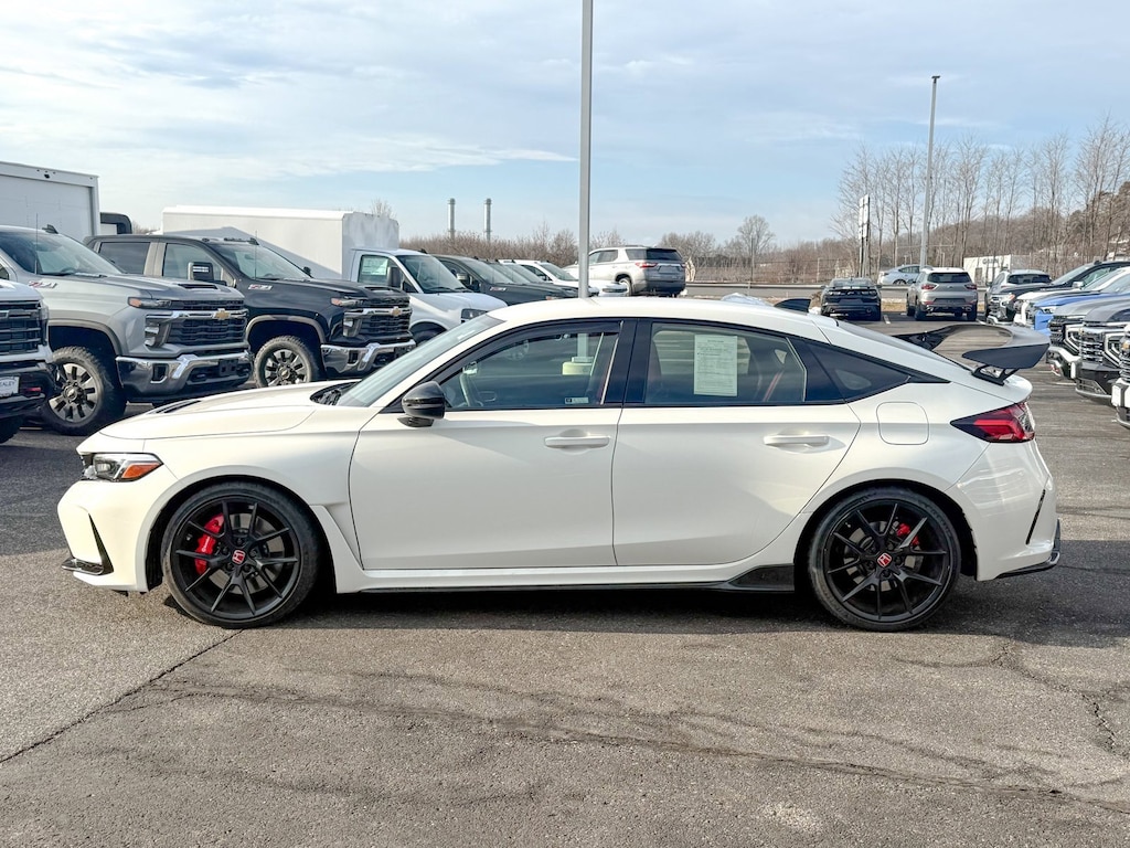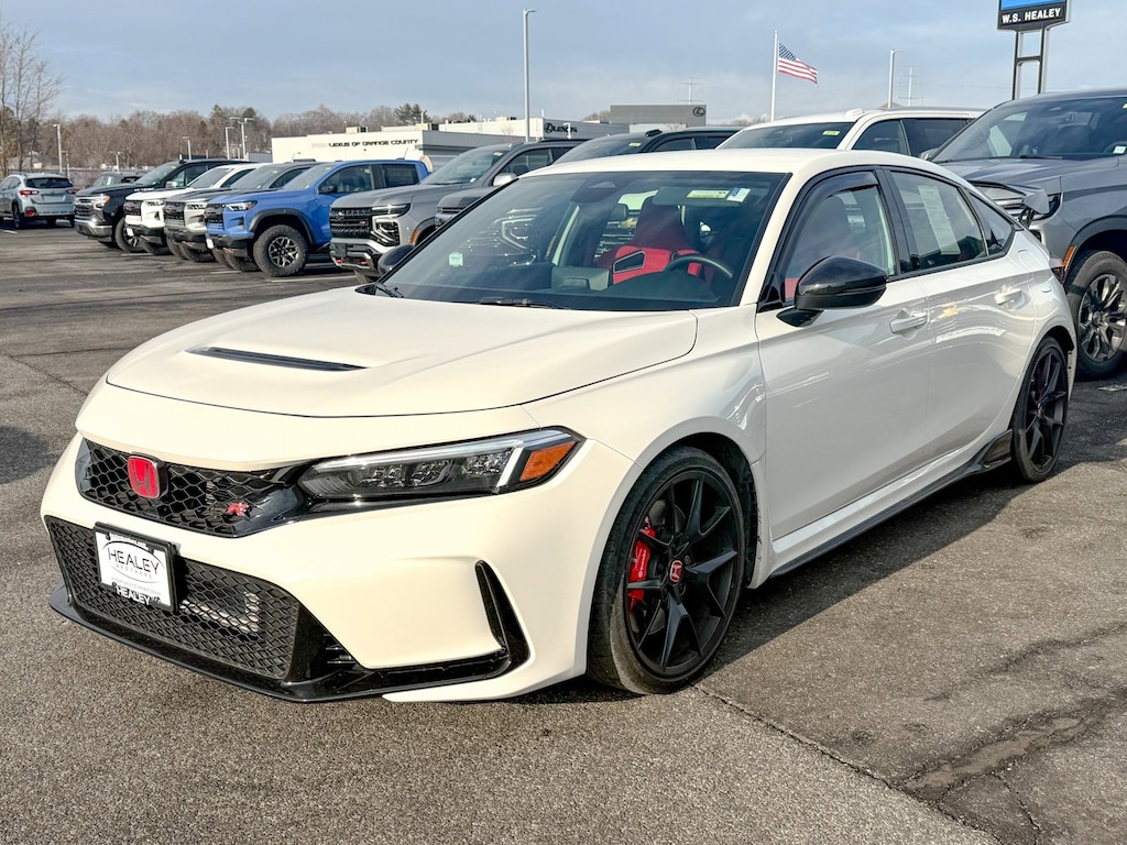 Certified. White 2025 Honda Civic Type R FWD 6-Speed Manual 2.0L I4 Turbocharged DOHC 16V LEV3-ULEV50 315hp 12 Speakers, 4-Wheel Disc Brakes, ABS brakes, Adaptive suspension, Air Conditioning, Alloy wheels, AM/FM radio: SiriusXM, Apple CarPlay/Android Auto, Auto High-beam Headlights, Automatic temperature control, Blind Spot Information (BSI) System warning, Brake assist, Bumpers: body-color, Compass, Delay-off headlights, Driver door bin, Driver vanity mirror, Dual front impact airbags, Dual front side impact airbags, Electronic Stability Control, Exclusively-Designed High-Bolstered Sport Seats, Exterior Parking Camera Rear, Four wheel independent suspension, Front anti-roll bar, Front Bucket Seats, Front Center Armrest, Front dual zone A/C, Front reading lights, Fully automatic headlights, Illuminated entry, Knee airbag, Leather steering wheel, Low tire pressure warning, Navigation System, Occupant sensing airbag, Outside temperature display, Overhead airbag, Overhead console, Panic alarm, Passenger door bin, Passenger vanity mirror, Power door mirrors, Power steering, Power windows, Radio data system, Radio: Bose Premium Sound System with SiriusXM, Rear anti-roll bar, Rear window defroster, Rear window wiper, Remote keyless entry, Security system, Speed control, Speed-sensing steering, Split folding rear seat, Spoiler, Steering wheel mounted audio controls, Suede-Effect Fabric Seating Surfaces, Tachometer, Telescoping steering wheel, Tilt steering wheel, Traction control, Trip computer, Turn signal indicator mirrors, Variably intermittent wipers, Voltmeter, Wheels: 19 x 9.5J Matte Black, One Owner.